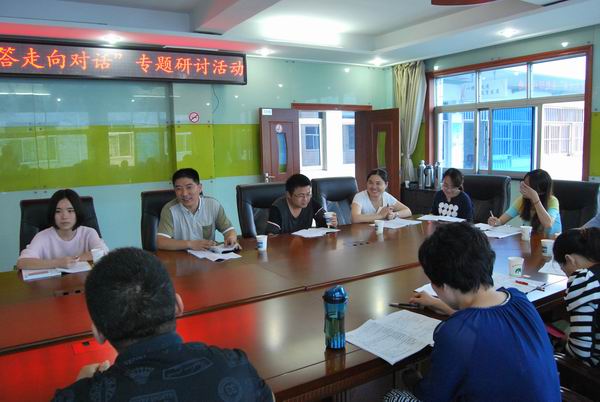听完课后,教师们趁热打铁,分两个会场围绕专题“从问答走向对话”进行研讨。各学校参加听课的老师们纷纷发表了自己的观点,对几位年轻教师进行了诚恳而精彩的点评。会场上有赞扬、有质疑、有讨论、有争辩,研讨氛围异常浓厚。原本因为天气原因决定半小时的研讨进行了一个小时还未结束。最后分管教学的韩小峰校长总结:要让师生在课堂上能通过平等、探究式的对话提高教学效率,必须要基于学生的基础、需要、兴趣来进行教学设计,确定科学准确的目标,创设适合学生发展的活动,让学生在活动中体验感悟,重点培养发展学生的学科核心能力。