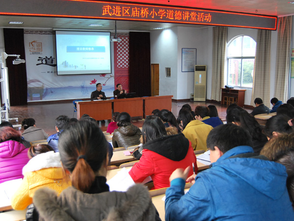 为践行社会主义核心价值观,深化教师道德修养,11月30日下午,庙桥小学在阶梯教室举办了以“爱岗敬业,幸福生活”为主题的道德讲堂活动。