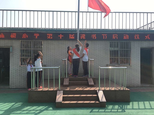 本次读书节启动仪式由六(4)班黄子怡同学主持。首先,六(1)班的读书小明星张千千同学把承载着读书梦想的五星红旗冉冉升起。接着课程中心的周水英主任为本次读书节作动员发言。她热情洋溢的讲话让全校师生明确了读书的重要性。最后六(5)班的柴恬同学向全校师生发出了读书倡议,让全校师生都参与到读书节活动中来,携手经典,博览群书,浸润书香,幸福成长。让读书成为习惯,让书香溢满校园,让书香润泽我们的人生。