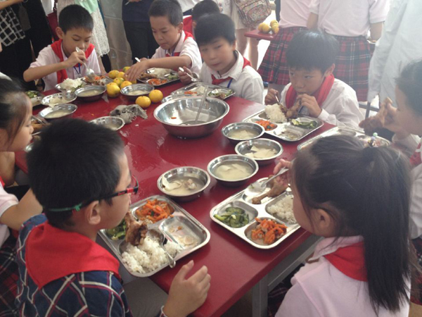 中午时分,我们在花小领导的带领下参观了花小的食堂。首先孩子们井井有条地进行分菜,接着安静地进行午餐,个个不挑食,不浪费。饭后他们自觉分工打扫,然后整齐地排好队回教室进行午后学习,有序而不吵闹。在整个参观交流过程中,八好习惯的常规教育在孩子身上体现的真真切切,每个孩子都给人留下了阳光、有礼、可爱的印象,他们富有活力和朝气,自觉而又自理,各具特色却都像花儿一般茁壮向阳。
