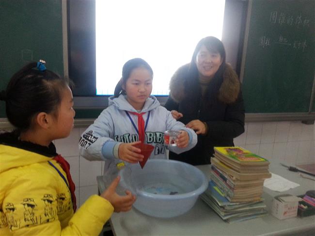 本次的教研活动由潘春美老师执教,潘老师执教的是《圆锥的体积》一课。整节课以“提出猜想→实验验证→获得结论”为线索,引导学生经历探索并发现圆锥体体积公式的过程。首先,潘老师引导学生观察底面积相等,高也相等的圆柱和圆锥,估计他们体积之间的关系,初步建立关于圆锥体积计算方法的猜想。接着,潘老师引导学生通过实验操作,探索并发现底面积相等高也相等的圆柱和圆锥体积之间的关系,即准备等底等高的圆锥与圆柱形容器各一个,用圆锥形容器装满水倒入圆柱形容器,根据3次正好倒满,得出圆锥的体积正好等于与它等底等高的圆柱体积的体积,进而验证或矫正原先的猜想,并推导出圆锥的体积公式。最后,潘老师引导学生回顾圆锥体积公式的探索过程,说说自己的体会,以梳理参与数学活动过程中积累起来的经验,进一步提升认识。这样教学,使学生又一次经历由建立猜想到实验验证,再到得出公式的全过程,并在这一过程中体会数学的内在美,感受数学方法的魅力,激发了学生参与探索活动的兴趣。随后,潘老师又组织了形式多样,有层次的练习,进一步让学生掌握圆锥的体积公式,体会圆锥体积公式的实际应用价值。