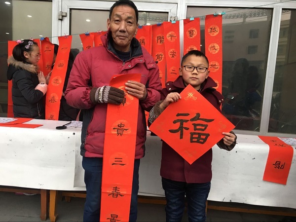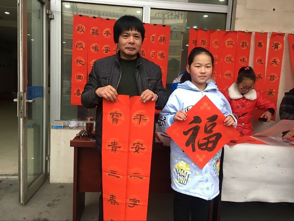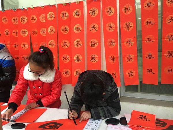 春节是中国人心目中最重要的节日之一,写春联、贴春联则是迎接春节传统习俗中最不可或缺的部分。崭新的大红春联不仅寄托着人们对新年的美好愿望,更承载着中华民族深厚的文化积淀。2016年1月18日庙桥小学书法社团到学府东苑社区开展“写春联,迎新春,送祝福”活动。十来位“小书法家”挥毫泼墨,为市民们义务写春联、赠春联,活动吸引了众多市民驻足观看。