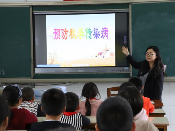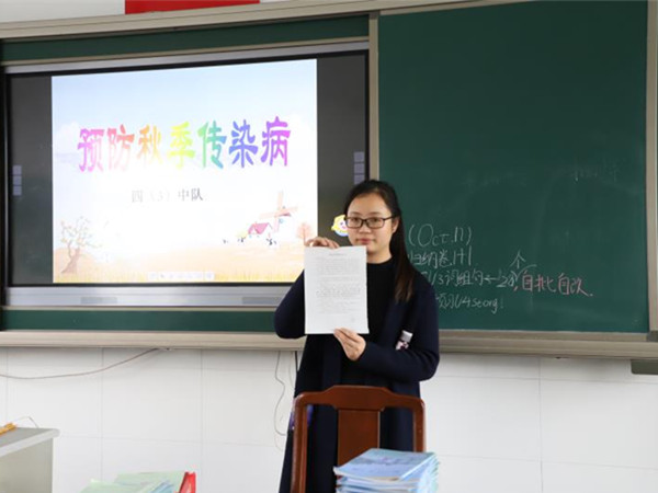 在活动中,各班主任利用PPT课件将秋季易发的传染病——水痘、腮腺炎、带状疱疹、流感等知识进行了宣讲,让学生知道了这几种传染病的主要症状、治疗措施和预防办法,并且通过一张张图片让孩子们在头脑中有了形象的记忆。最后,各班主任引导学生要树立预防传染病的意识,注意个人卫生和防护,养成良好的卫生习惯。为了将传染病预防工作延伸到学生的家庭生活中,各班主任还发放了《预防秋季传染病告家长书》,让各个家庭也普及相关知识并做好预防工作。