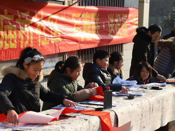 让学生走出学校,走进社区写春联,庙桥小学组织开展这项活动由来已久,更是年年坚持。这样的活动,既丰富了学生的假期的文化生活,展示了自身的书法特长,同时也更好地传承了中华民族传统民俗文化。使得学校书法教育更具生命力,散发出熠熠的光彩。
