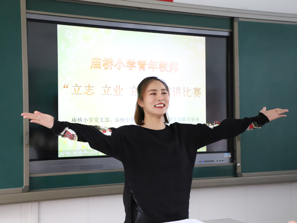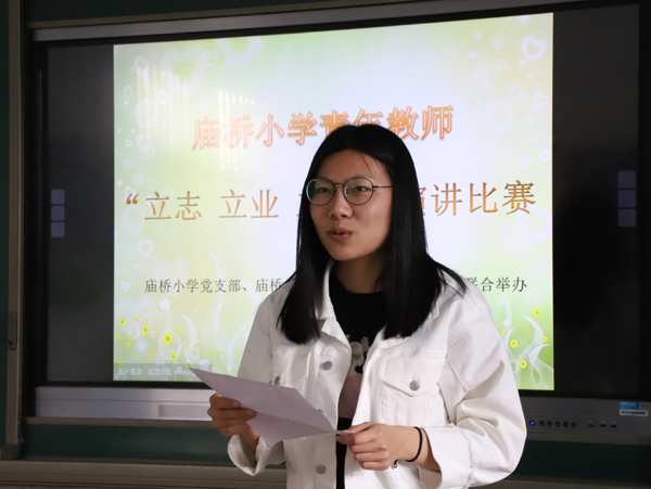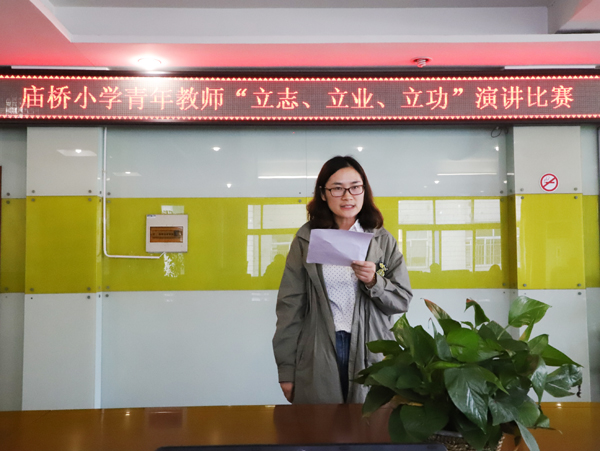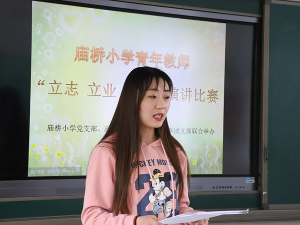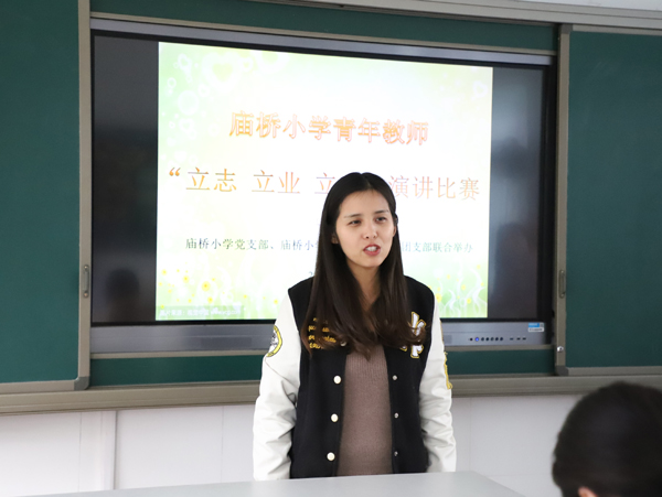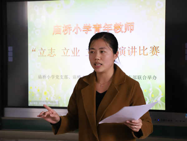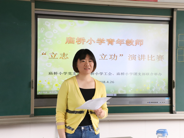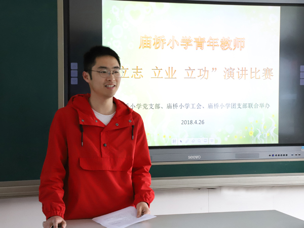 为了帮助青年教师树立正确高尚的从教观、事业观、人生观,真正做到讲政治、有信念,讲规矩、有纪律,讲道德、有品行,讲奉献、有作为,同时也为了在学校营造“发现感动、传递感动、学习感动”的良好氛围,用身边的榜样教育人、影响人、感染人,切实加强教师队伍建设,2018年4月26日,正值五四青年节前夕,庙桥小学党支部、工会、团支部联合开展了青年教师“立志、立业、立功”演讲比赛。