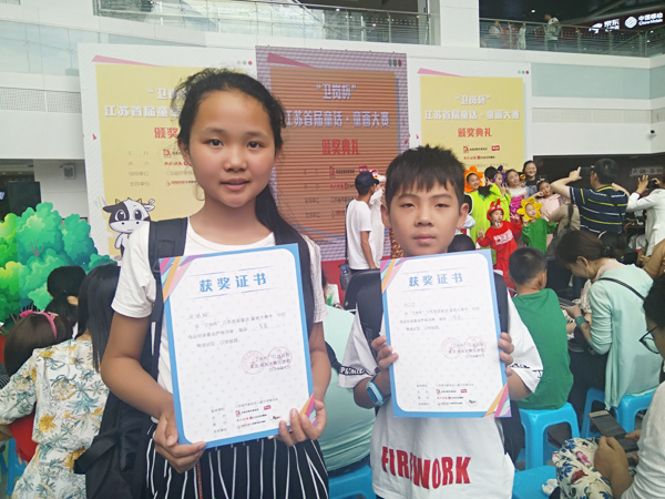 6月3日,庙桥小学两名学生张冰悦和许志华在学校美术教师沈建文的陪同下,从南京颁奖现场捧回两个江苏省首届童话.童画大赛一等奖。