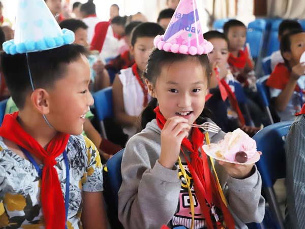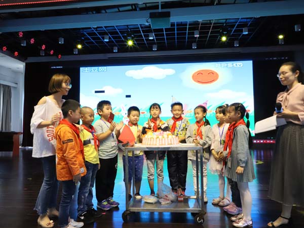 上午10点,参加活动的同学们来到学校大礼堂。活动在《我的祖国》经典诗朗诵中揭开了帷幕,六年级的赵亚军和金文惠同学时而慷慨激昂,时而深情款款,加上悠扬的配乐,高清的祖国山河美景画面,让同学们听得如痴如醉。“我爱国旗”的互动环节中,大家一起高声记诵祖国和国旗的名字,述说小国旗的亲手制作。小朋友们对国家和国旗的印象随之铭刻心间。随后,看国旗的介绍视频和国旗背后中华儿女默默守护和奉献的故事,更是激起了孩子们崇尚英雄、立志为国的信念与志向。由国及人,在场的几位“和祖国妈妈一起过生日”的孩子上台,谈谈这个特殊的生日活动的感受和心愿,全场的孩子一齐为他们庆生,为祖国妈妈庆生。那一刻,很自然地,大家便与祖国融为一体。在场的老师和韩小峰校长也纷纷谈到了感受和希望,为孩子们和祖国妈妈奉上祝福,寄语孩子们心系祖国,茁壮成长。孩子们在欢快的《生日歌》旋律声中分享一口口甜美快乐的生日蛋糕,活动达到了最高潮。最后,在响彻云宵的“祝祖国妈妈节日快乐,我们永远爱你!”的集体祝愿声中,活动告一段落。