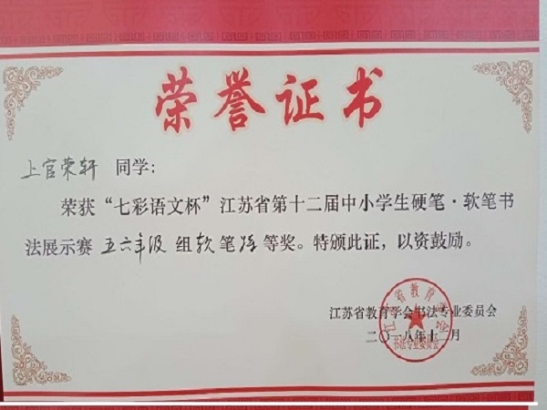 本次比赛由江苏省教育学会书法专业委员会和《七彩语文》杂志社联合主办,是在全省各市书法作品选拔的基础上进行的现场赛分小学低年级组、中年级组、高年级组和中学组四个组别,包括硬笔和软笔书写。庙桥小学五3班的上官荣轩、五(4)班的张妍两位同学历经层层选拔,从全省上百万中小学生中脱颖而出,最终进入到书法展示赛的现场。最终,上官荣轩同学以扎实的书***底和沉稳的临场表现,获得了软笔的特等奖,张妍同学凭借出色的隶书获得了硬笔组的一等奖。