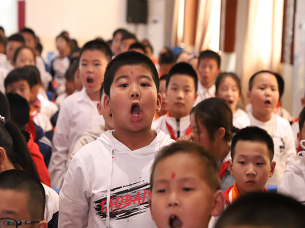 紧接着是“朱砂启智”。陈校长和张伟主任用朱砂在学生代表们的额头正中点上红痣,希望学子们从此心明眼亮,做一匹驰骋天下的千里马!接下来的“开笔礼”是由我校书法社团的优秀学生代表,现场带领一年级的学弟学妹们在描字卡上教写“进”字。最后是由一(1)班的王晨曦小朋友带领同学们一起宣誓:走好路,排好队,做好操,扫好地,吃好饭,读好书,上好课,发好言,写好字,唱好歌。学生们的誓言响彻云霄、气势如虹!