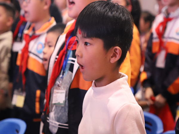 第二篇章伊始全体学生合唱了《中国少年先锋队队歌》。顾主任宣读了新队员的名单,一年级212名新队员被批准加入中国少年先锋队,成为一名光荣的少先队队员,在雄壮有力的《出旗曲》中,少先队旗手与护旗手们迈着整齐的步伐,精神抖擞地进行着庄严的出旗仪式。仪式上,少先队大哥哥、大姐姐为新入队的弟弟、妹妹佩戴了红领巾!伴随着队歌的再次响起,这些小小先锋队队员也明白了自己身上肩负的光荣使命。