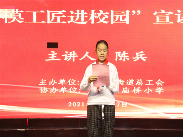 随后,庙桥小学学生代表沈一想发出倡议:希望同学们学习劳模工匠先进事迹,弘扬新时代劳模精神,认真学习专业知识,努力提高自身素质,让工匠精神成为青少年成长成才的精神动力。
